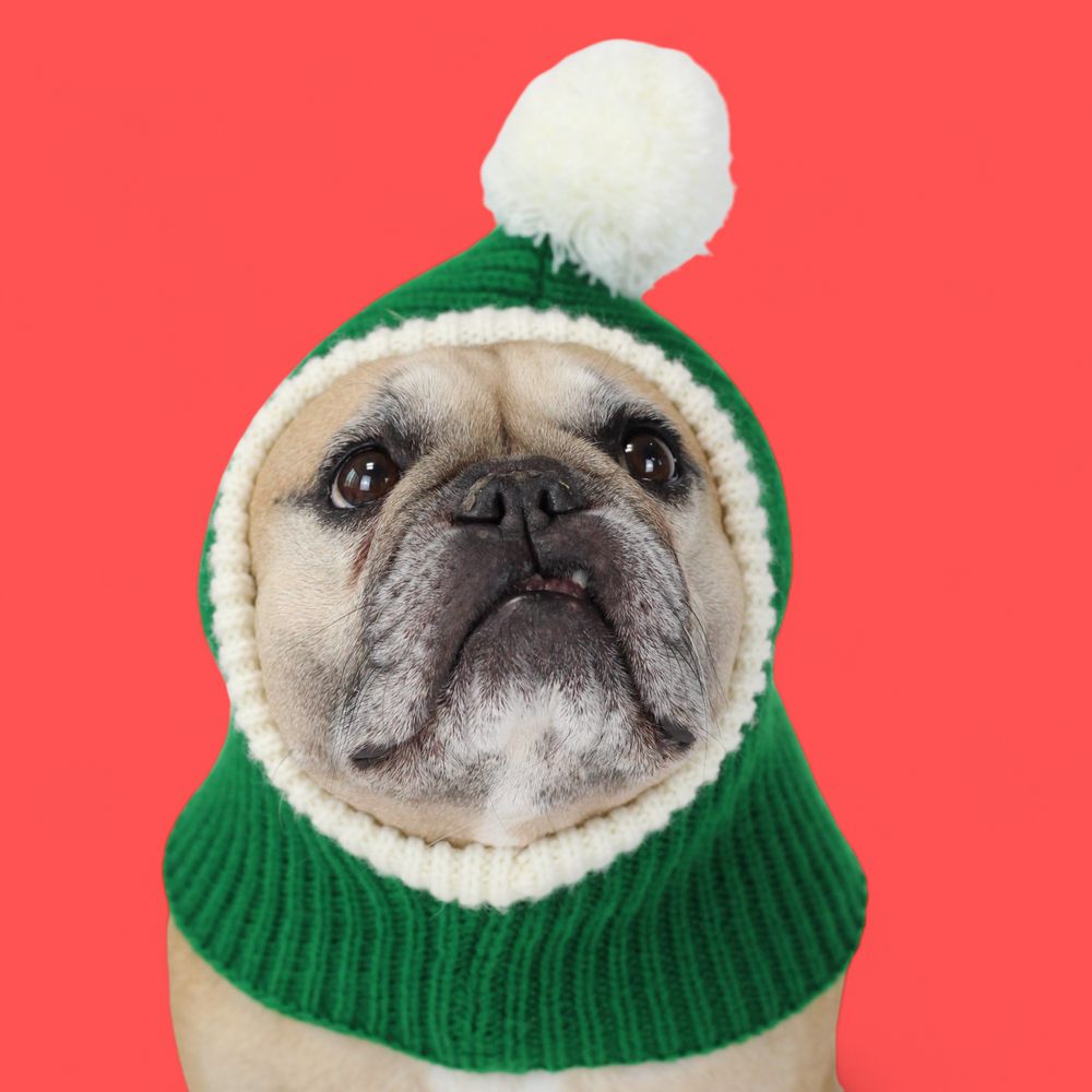Awesome warm Green Christmas Beanie. This beanie is knitted and has a great fit.This beanie has a good stretch, please look carefully at the measurements below. Dog's with small to medium sized heads will fit the M beanie whereas dogs with larger to  big heads will feel more comfortable in the L size.  The model in these picture is wearing the M size Christmas Beanie.