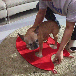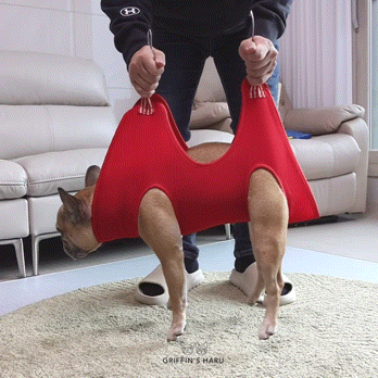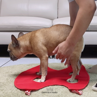 Place the grooming mat on the floor and put your dog's legs through the four holes. Can use either end of the grooming hammock as the front. The model dogs in the instructional video need more support for their heavy heads so we are using the longer end as the front, but both sides work, just depends on what is more comfortable for your dog.