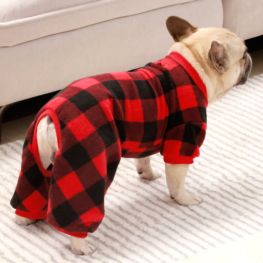 The Christmas PJs are designed with shorter front legs and wider back legs to ensure your pup's comfort while sitting or walking, minimizing any discomfort!